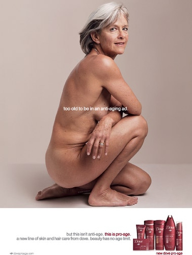 The Dove Pro-Age campaign launched in 2009 put forth this image to promote their new line of products for older women. The text reads, “…too old to be in an anti-aging ad… but this isn’t anti-age, this is pro-age. A new line of skin and hair care from Dove, beauty has no age limit…” This is the linguistic message. If read completely objectively, the text suggests that the faithful people at Dove have created a new line of products that support the natural aging of women, as opposed to fighting it. The text also suggests that most anti-aging ads display much younger women, as opposed to the actual target market of women in their fifties and sixties. The denoted image is a woman with graying hair, in a hunched yet regal position, totally nude. She is tan, married and seemingly modest (strategically covering all inappropriate areas). The connotated image is much more complex. She looks happy and confident, sentiments not regularly expressed by women looking to anti-aging products for assistance. The advertisers at Dove hope to encourage women to buy their products because they love themselves, not because they hate themselves. They hope to be the company to put a positive spin on self-improvement and personal hygiene. The most obvious rebuttal to this advertisement is that these products are still supposed to hide the effects of natural aging, clearly making the statement somewhat hypocritical to begin with. Furthermore, this woman is exceptionally fit, with a pretty face and toned arms. She complies with most standards of beauty in modern culture.