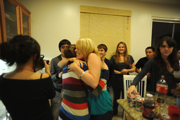 The image: A kitchen with two young women hugging, surrounded by happy, interested onlookers.