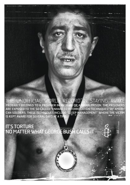 This is an advertisement from Amnesty International. It includes a shirtless man wearing an Olympic-style medal around his neck, accompanied by a textual element. The text reads, “The unofficial world record in staying awake probably belongs to a prisoner in an Iraqi or Afghan Prison. The prisoners are exposed to the so called ‘enhanced interrogation techniques’ by American soldiers. These techniques include ‘sleep management’ where the victim is kept awake for several days at a time”. Below, in slightly larger and bolder text is written, “It’s torture no matter what George Bush calls it”. Both of these pieces of text constitute the linguistic message of the ad. Because of the references to Bush, Iraq, and Afghanistan, the viewer is prompted to think about the U.S. and their two ongoing wars with each respective country (‘anchoring’, according to Barthes). Accurate reception of this message requires, of course, knowledge of the English language, along with cultural knowledge relating to current affairs: the US-Iraq war, the US-Afghanistan war, the man who declared these wars (Bush), and the controversies regarding treatment of prisoners by American soldiers.