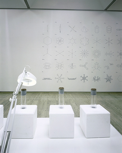 5 Carsten Nicolai creates works of art that fuse sound and visual effects. His work usually has a touch of "randomness," such as the work pictured above. Here, he had visitors help create snowflakes, which can never be identical to any previously generated snowflakes. His media consisted of "acrylic tubes, polystyrene boxes with copper tubes, dry ice, lamp with magnifying glass, wall drawing, sound, random noise generators," and the size specified was, "dimensions variable."