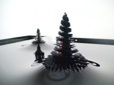 1. Ferrofluids. Basically, ferrofluids appear as a black fluid. They are prepared by dissolving nanoscale ferromagnetic particles in a solvent such as water or oil and remain strongly magnetic even in a fluid condition. Therefore, they are more flexibly transformable as compared to iron sand. It is well known that ferrofluids form spikes along magnetic field lines when the magnetic surface force exceeds the stabilizing effects of the fluid weight and surface tension. (See Image 1) http://www.robaid.com/tech/where-art-an ... ptures.htm