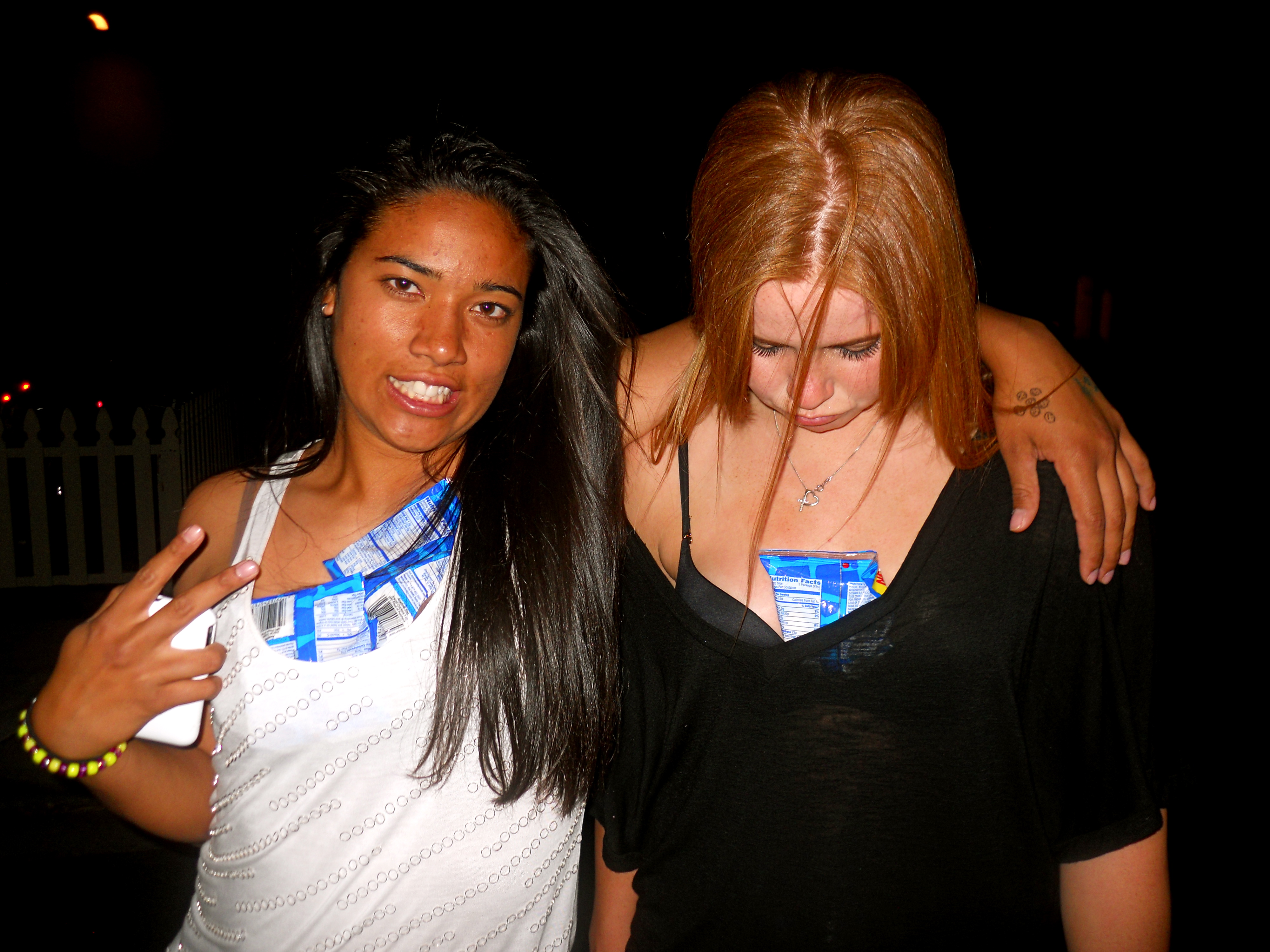 Further, the denotative message depicts two young girls photographed at night with bags of chips shoved down the front of their shirts. The female on the right is giving an awkward smile and a peace sign to the camera and has her arm around the girl on the right. On her left hand, that is seen wrapped around the other girl’s shoulder, are tiny drawings. She is wearing a white tank top shirt and a bracelet on her right wrist. The girl pictured on the right is looking down at her chest frowning. Her shirt is off her shoulder and her bra is showing. She is seen staring down at the bag of chips that is stuffed down her shirt. She is seen wearing a black shirt and a silver necklace around her neck. The denotative message, again, is what we see as an audience, rather than what we know.