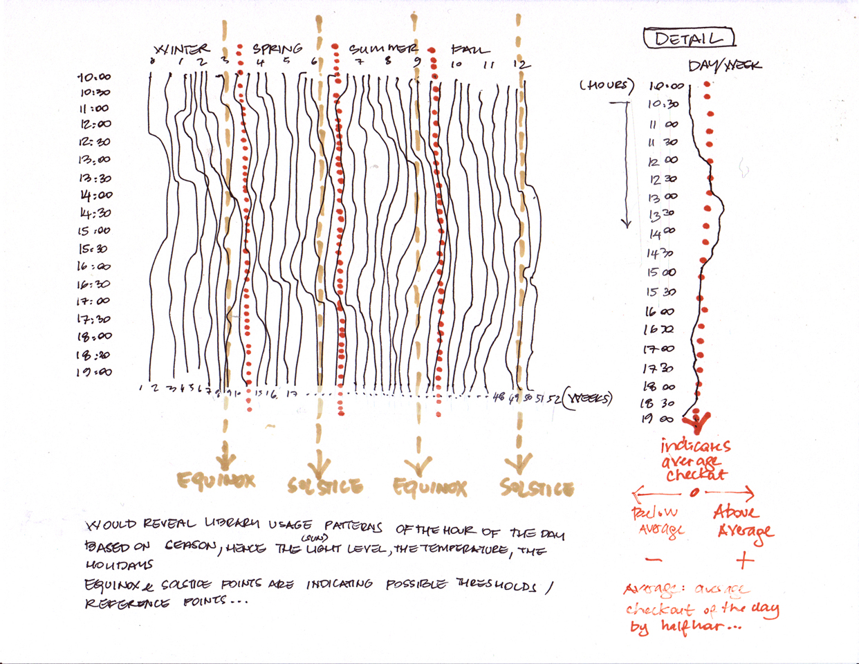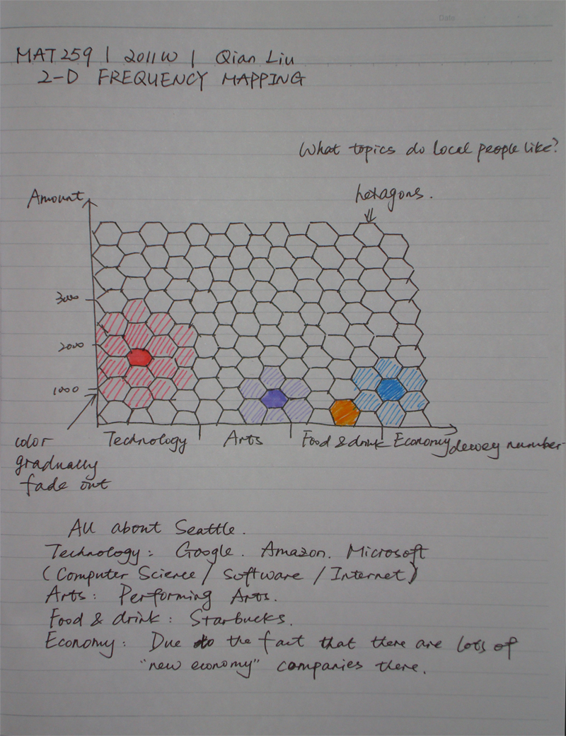 My idea for the first project is to illustrate the relationship between library checkouts and real world events. There will be a line graph of the checkouts for each of the topics. Hopefully we will see significant changes around some important dates (e.g. Obama election, financial crisis, global warming summit, ..). Those topics at the doodle are not final, yet. I just picked some that could result in an interesting visualization.