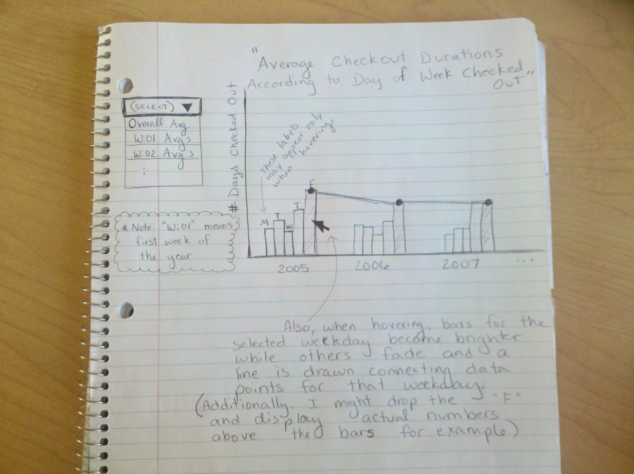Attached is a time plot drawing. The number of days an item is checked are are plotted according to the day of the week that the item was checked. It is an interactive graph and scrolling over the bar for a specific day will highlight the other bars for that day and connect them by connecting the data points for that day. Also, there is a drop-down menu allowing users to view entire year averages or averages for specific weeks throughout the year.