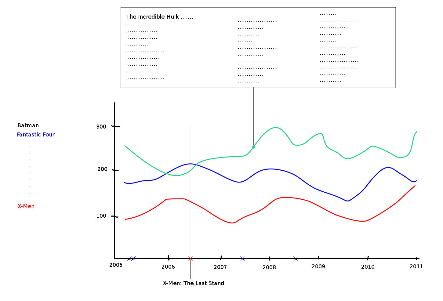 The menu on the left side lets the user select the comics for which data is displayed. Only comics that have had movies released between May 2005 and January 2011 are included in this visualization. All lines are color coded to the superhero, if possible the colors should be derived from the heroes costume.
