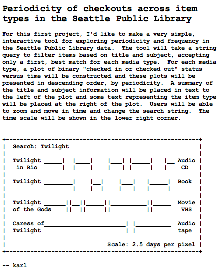 My idea for the first project is to illustrate the relationship between library checkouts and real world events. There will be a line graph of the checkouts for each of the topics. Hopefully we will see significant changes around some important dates (e.g. Obama election, financial crisis, global warming summit, ..). Those topics at the doodle are not final, yet. I just picked some that could result in an interesting visualization.