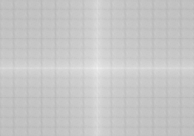 Now, one of the main uses of fourier transforms (fft) in image processing is to remove periodic artifacts, such as noise or other patterns. This is done with the use of general filters (high pass, etc., not to be confused with photoshop's filters, which affect only the spatial domain), or by hand using notch filters. Notch filters are just a way to block small parts of the spectrum. You can think of them as little dots which you cover the artifacts with. Using an fft on an image will give two things. One is the magnitude (how much signal is present at any given point) of frequencies in the spectrum, and the one with which we're concerned. The other part, the angle or phase in the complex plane, is not important for us, but here is what it looks like for our image: