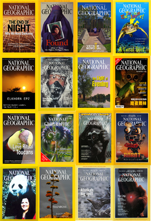 For this assignment I took a collection of images, particularly, a collection of 43 National Geographic magazine cover images, and created a visual database that allows the viewer to see all of the covers at once. This composite image is an overlapping of all 43 cover images, all of which have a very low opacity, which leaves the viewer able to see every image ta once, but unable to make out any particular details of the image. This creates an image that is a representation of the 'average' National Geographic cover. You can make out the overwhelming form, tone, and composition that is typical of the covers, an you can still read the title text which indicates that this is a National Geographic cover.
