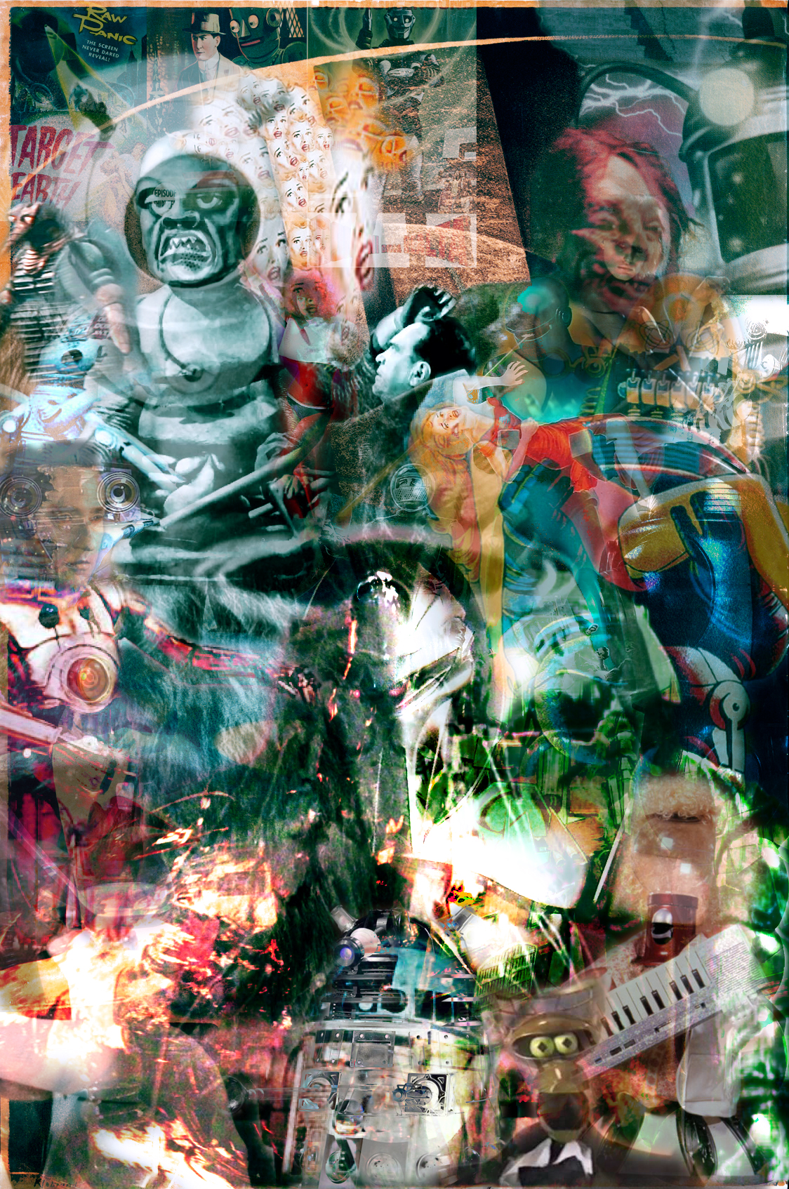 For this project, I wanted to examine the history of robots in film, starting in the 20s, and going up into the 1990s, specifically 1996 with the age of Mystery Science Theater 3000, where – in my opinion- robots hit their peak of greatness. The order I layered them was at first, based on size of picture rather than chronological date, although after getting started, I started unconsciously grouping them into loose chronological layers. I started with Maria from Metropolis, eventually adding Ro-Man from Robot Monster, Tik Tok from Return to Oz, Jet Jaguar from Godzilla vs Megalon, Robby from Forbidden Planet, Chani from Devil Girl From Mars, Gog from Gog, Tobor from Tobor the Great, Robocop, The Terminator, Talos from Jason and the Argonauts, the Venutians from Target Earth, Moguera from The Mysterians, GORT from The Day the Earth Stood Still, The Robot from The Robot vs. the Aztec Mummy, the Killbots from Chopping Mall, Q from Houdini’s The Master Mystery, Mecha Godzilla, some Volkites from Undersea Kingdom, the particularly weird looking Iron Man from The Phantom Creeps, Golem from The Golem, the Mechanical Monsters from that Superman movie, a Neptune Man from Invasion of the Neptune Men, Torg from Santa Claus Conquers the Martians, Val, Aqua, Catskill and Phil from the Heartbeeps, the Daleks from Dr. Who, Hal from 2001: A Space Odyssey, Cylons from Battlestar Galactica, Box from Logan’s Run, C-3P0 and R2-D2, one of the replicants (Pris) from Bladerunner, Lisa from Weird Science, Transformers, Nova S-A-I-N-T from Short Circuit, Data from Star Trek, and then finally Crow, Tom Servo and Gypsy from Mystery Science Theater 3000.