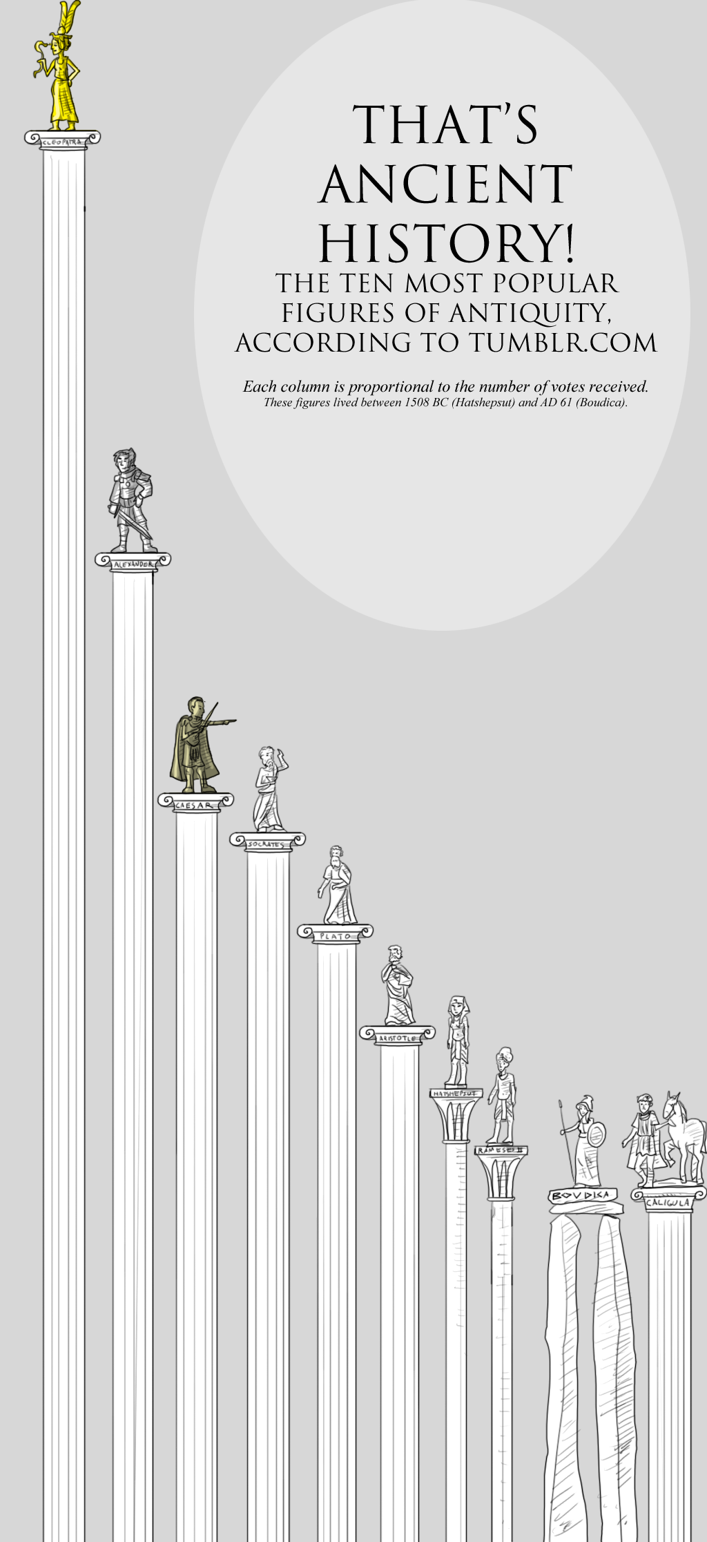 I created a very crude version of a map where one pixel is equivalent to one survey response, just to figure out the proper proportions for everything: Based on that, I created a final version in the style of an old map: As an aside, I also created a graphic inspired by [url=http://upload.wikimedia.org/wikipedia/c ... C_1884.jpg]yet another Victorian infographic[/ur] depicting the ten most popular ancient figures on tumblr.com. While the data visualized isn't spectacularly interesting (I suppose it's mildly interesting that Caligula was the only Roman emperor to make the cut, or that Cleopatra beat Alexander the Great, and encouraging that somebody as neat as Hatshepsut made the cut), it was a valuable exercise in clarifying and resolving the aesthetic issues the project was having after the first iteration of the map.