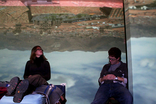 Some artists also choose to place humans in their camera obscura works, such as this one where once again we see a camera obscura image inverted on a wall. The two people involved in the photographed space are shown interacting with the scene.