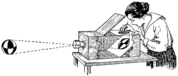 This image depicts a woman tracing an image being projected through the camera obscura. You see that as light enters through the hole, it is bounced off 2 mirrors which reflects the inverted image.