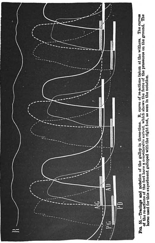 In Steve Mamber’s article, he discusses Marey’s earlier work before his chronophotography. He “developed strip-like machines” which captured the motion of things like a person’s walk or a pianist’s fingers moving across the keys. In Marey’s book, “Animal Mechanism” he goes over these machines and studies in more detail. He invented an instrument that would translate the vibrations of a foot or hoof hitting the ground into markings on smoked glass.