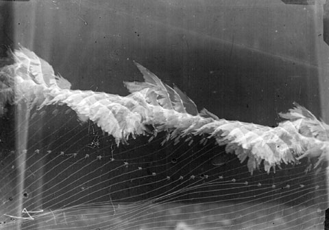 Compared with the movement itself, Marey paid more attention and effort to the force determining the movement. To assist in his understanding of the mechanism of the wing in relation to the movement of air and the effects of air pressure on the wing, Marey wanted to photograph the wing’s movement in three dimensions. In July 1887 he took several picutures from above the bird, which would then be coordinated with whose he made parallel and perpendicular to the axis of its flight. The applications of this study were extraordinary: from the data furnished by the different sets of photographs he sculpted plaster models of the gull and the pigeon in flight. Each model, slightly smaller than life size, depicted a single phase of the wing as it moved through one complete revolution. He then mounted the sculptures into a very large zoetrope, which can help people view the bird’s flight from various aspects and reconstruct the revolution of its wings, invisible to the naked eye, in three dimensions in slow motion. Marey explained that "From the point of view of the resistance experienced, whether the solid body be in motion in calm air or whether it be immobile in an air animated with movement is indifferent." He thus presented the principle underlying his later smoke machines: air propelled against an unmoving form. He was then tackling a subject that had almost never been studied before: the problem, crucial for aviation, of the air flow around a surface. Sources: