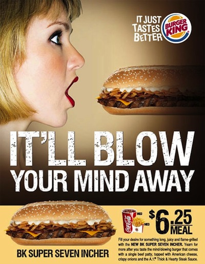The next part of this advertisement is the linguistic message. The logo in the corner indicates that the brand is Burger King – a well-known international fast food chain. “It’ll Blow Your Mind Away” is an idiom that specifically American audiences can identify with. Burger King intends for its audience to read this statement as meaning the sandwich is so delicious that the mind cannot handle it. People of different cultures or languages would interpret this statement as literally getting one’s mind blown away. The phrase “Super Seven Incher” can also be taken to literally refer to the size of the sandwich that Burger King is trying to sell. However, both these phrases also have extremely sexual connotation which leads me to the next way of viewing and analyzing an image.