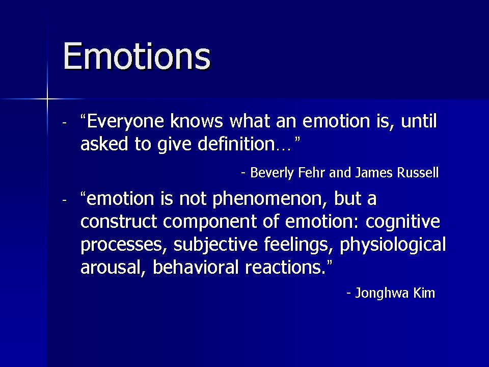 My project of The Emotional Room is a combination of detection of human emotion with music and pattern projected walls based on the audience’s emotion. With this kind of project, the audience experiences a private room that combines visual and audio performance that is created specially and personally only for him/her. Below is an image showing what the room will look like as the system works. Detailed project proposal is attached below: Because the PPT file cannot be uploaded, my powerpoints will be posted in image form below:
