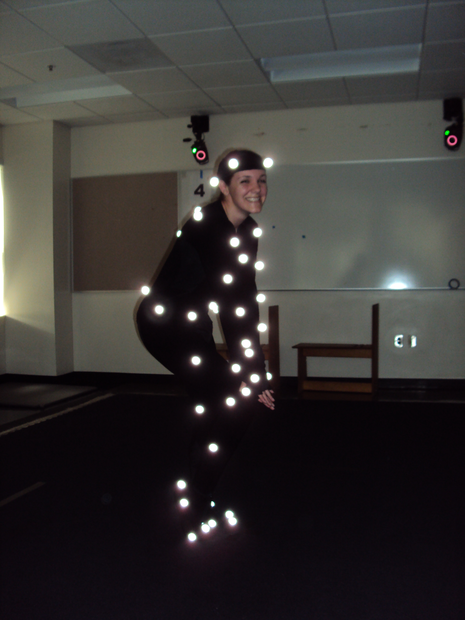 Markers coated with a retroreflective material are attached to a suit, the camera can asses their position.