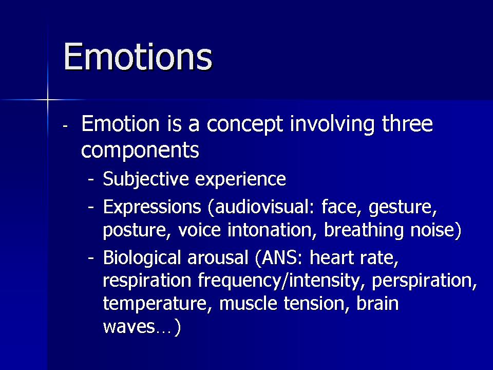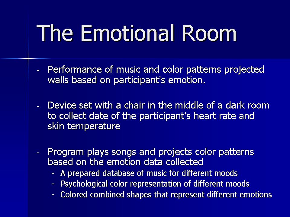 My project of The Emotional Room is a combination of detection of human emotion with music and pattern projected walls based on the audience’s emotion. With this kind of project, the audience experiences a private room that combines visual and audio performance that is created specially and personally only for him/her. Below is an image showing what the room will look like as the system works. Detailed project proposal is attached below: Because the PPT file cannot be uploaded, my powerpoints will be posted in image form below: