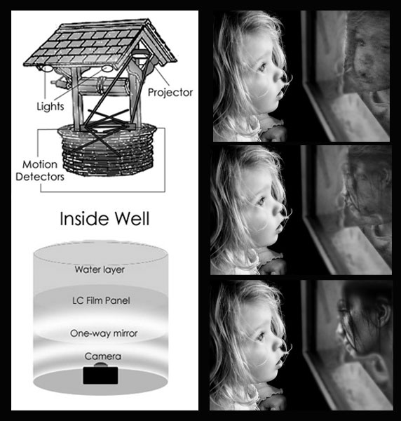 The installation I’m proposing takes the form of a well in the middle of a gallery room. The participant look the well and sees they’re reflection clearly. As the participant leans in more, their image becomes less clear as another unknown person’s reflection is layered with their own. By leaning in further, their image completely dissolves, and only the image of that unknown person stares back at them.