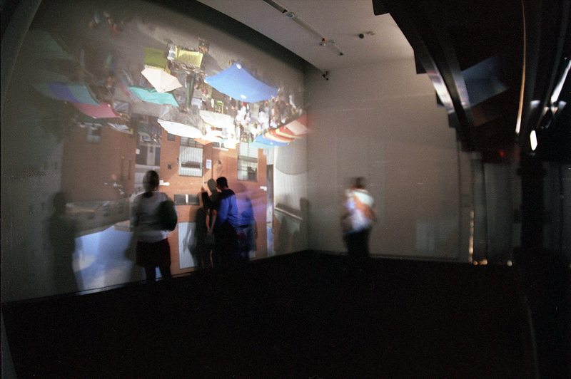 Some artists also choose to place humans in their camera obscura works, such as this one where once again we see a camera obscura image inverted on a wall. The two people involved in the photographed space are shown interacting with the scene.