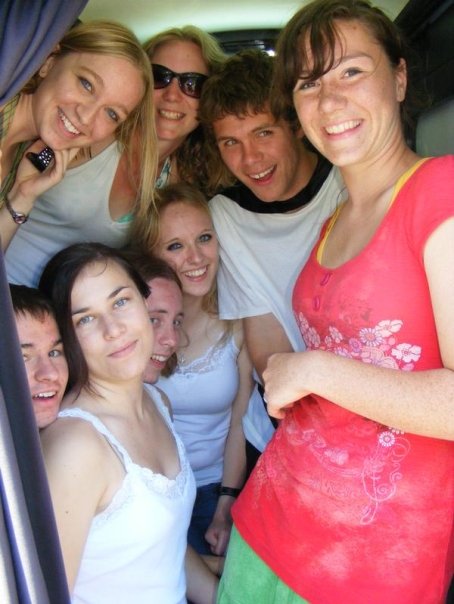 The 'casual'/non-corporate image I chose is a snapshot of eight young men and women who have crammed themselves into a small space. Everyone is smiling and looking outward from the space towards the camera. Four of the faces are staggered across the top of the frame, while the other four gradually emerge outward from the center towards the bottom left corner of the image. One person is wearing sunglasses, another is holding sunglasses; the left-hand side of the image is framed by a purple curtain which is being held back so that everyone's face can be seen. The subjects are wearing white tops, except for the girl in the foreground who is dressed in bright pink and green. As far as non-coded iconic imagery goes, there aren't a lot of clues in here as to what this situation signifies / what all of these people are specifically doing.