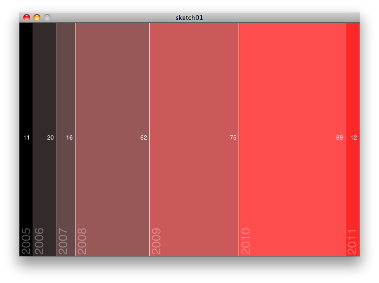 Please post your first processing built visualization project here. The project needs to include a SQL query, and be realized in Processing. Give a brief introduction as to what you aim to achieve and describe any aspects either visual or technical, you would like to bring attention to.