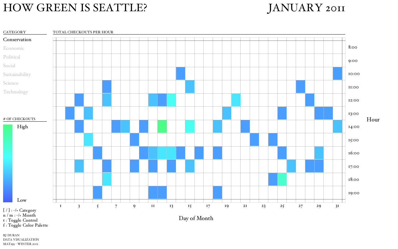 There is a simple amount of interaction to allow the user to navigate through the data for each month within 2011 shown in the bottom left. The mouse was used to provide basic hover functionality showing the total checkouts per day for a given hour. A secondary color palette was also implemented to show dark and light palettes. I used a simple grid to do the layout of elements. The code itself is a little crude since we had somewhat of a short time frame to implement a design but I tried to keep things organized.