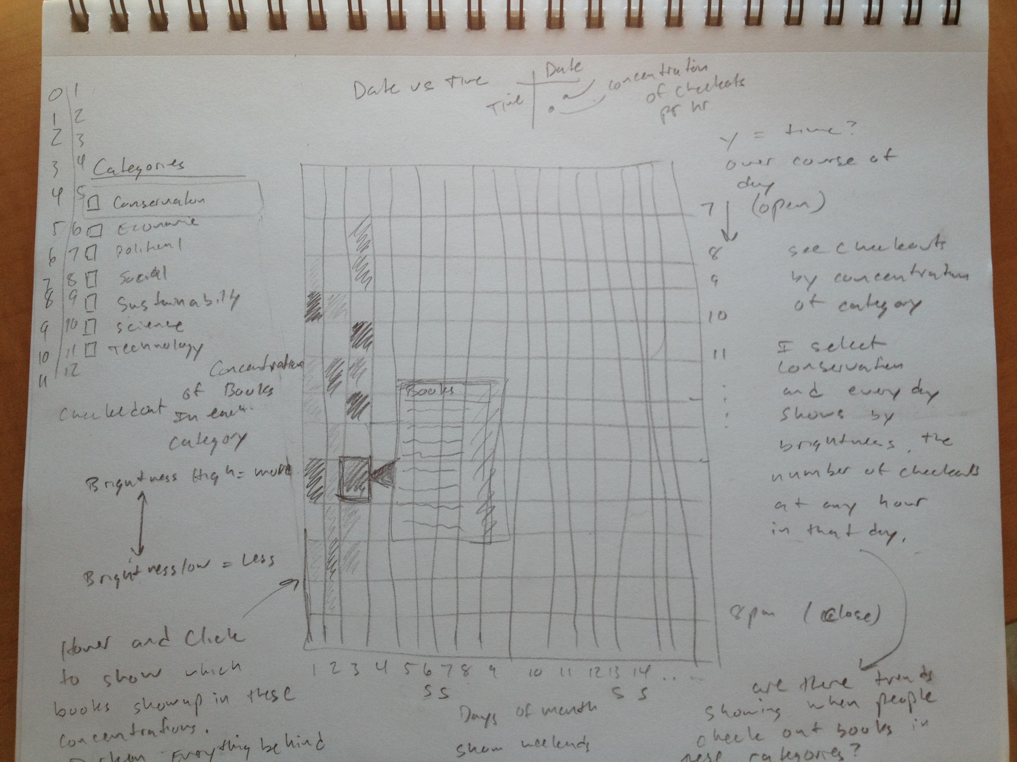 Through the library data I tried to illustrate the reading habits of people based on the number of checkouts per hour per day within 7 categories: Conservation, Economic, Political, Social, Sustainability, Science, and Technology. By grouping titles into these categories I was able to make sense of the large amount of information.
