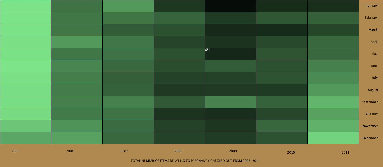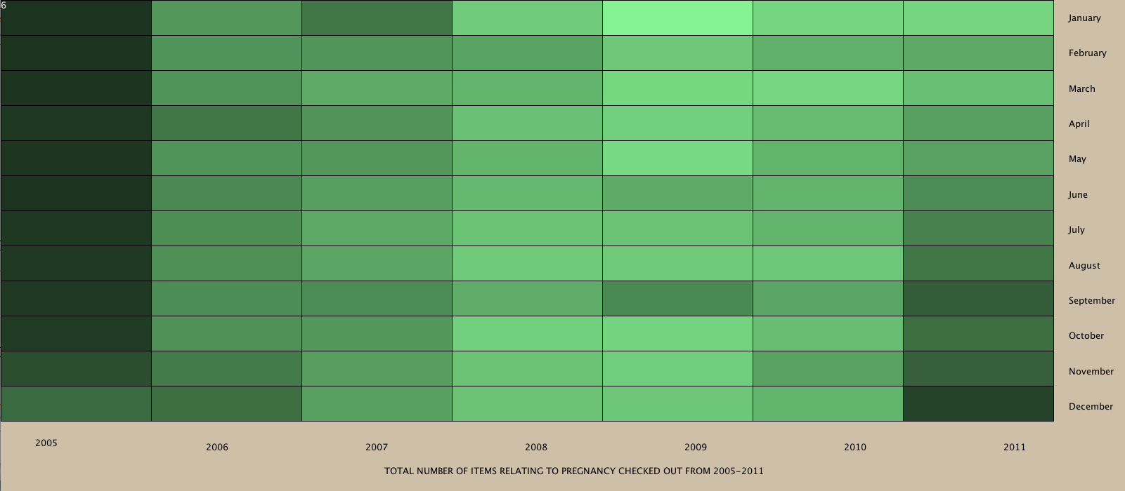 As you scroll over a cell, the number of items checked out that month will popup in white, and the higher the number the darker the cell. In my observations, I definitely see some kind of relationship here. It seems that in January, the 1st of the year, these items are checked out the most frequent. I also see that years 2008-2010 stand out the most on the darkness scale. Does that mean there were more pregnancies in just 3 years versus the others? This is the kind of information I would like to examine and see if it has any truth to it.