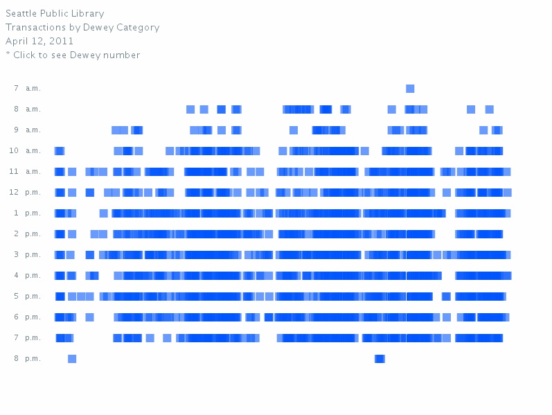 This spatial map plots the number of Seattle Public Library transactions for April 12, 2011 by hour checked out and Dewey category. The user clicks the mouse to reveal Dewey numbers for that location.