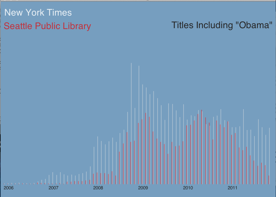 Here is my Correlation Project relating the subject matter of Obama between the SPL and NY Times API database. I found a strong correlation between the 2 sets of data and find it very interesting since the data is from the NW corner of the United States (Seattle) and the NE corner (New York).