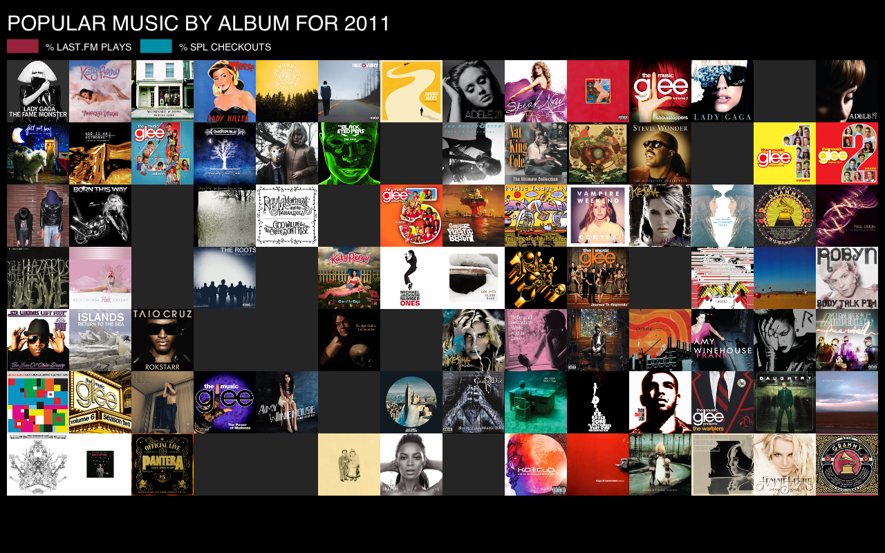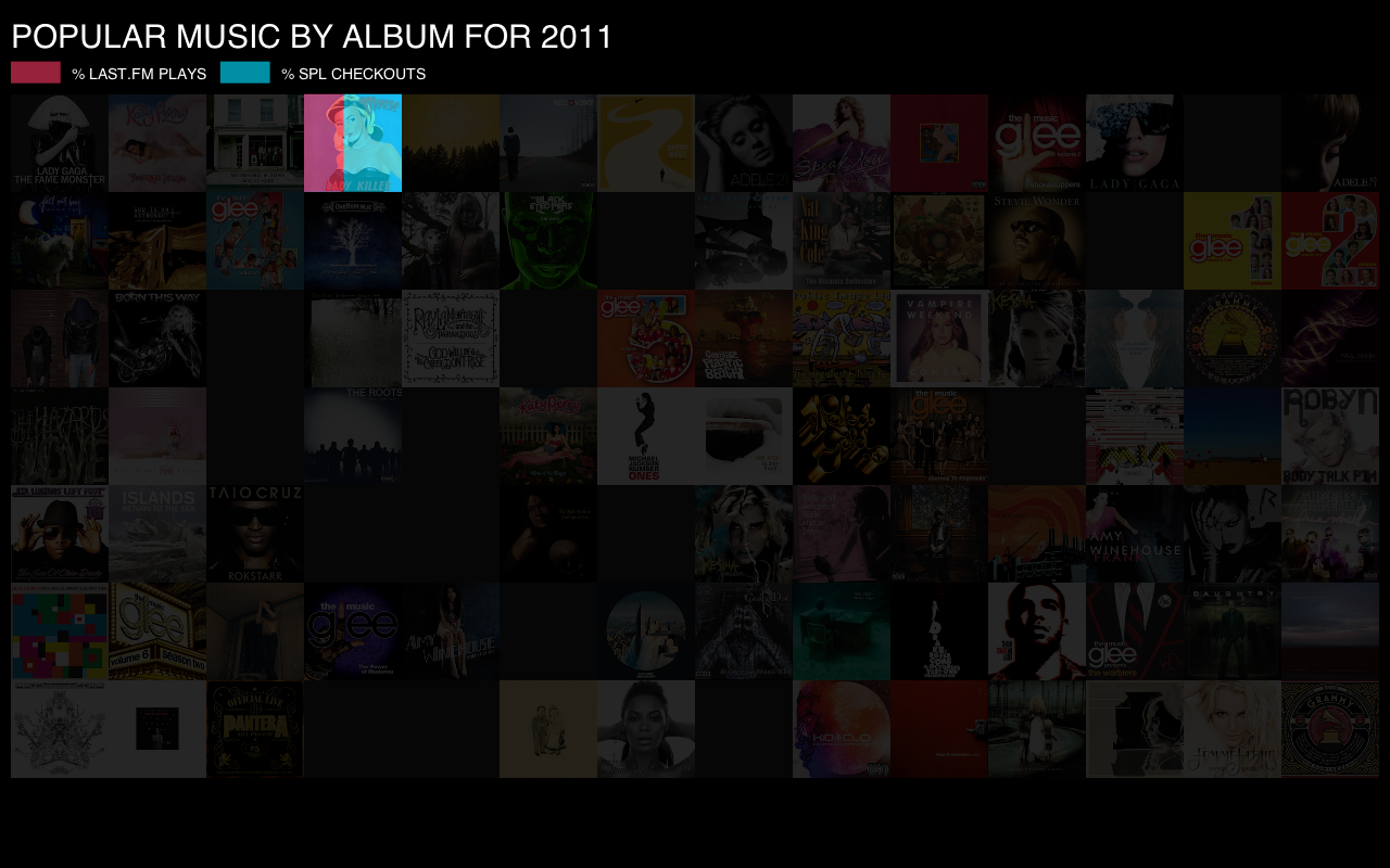 I tried to communicate the difference between last.fm album plays and SPL checkouts and ran into a few issues. The biggest issue is that the actual data shows that last.fm is by far the most used method for listening to music. Because of this, the scale for last.fm is between hundreds and millions of plays per album vs zero to a little over one thousand for SPL checkouts. I had to normalize the data and represent it as a percentage to illustrate the difference between the two.