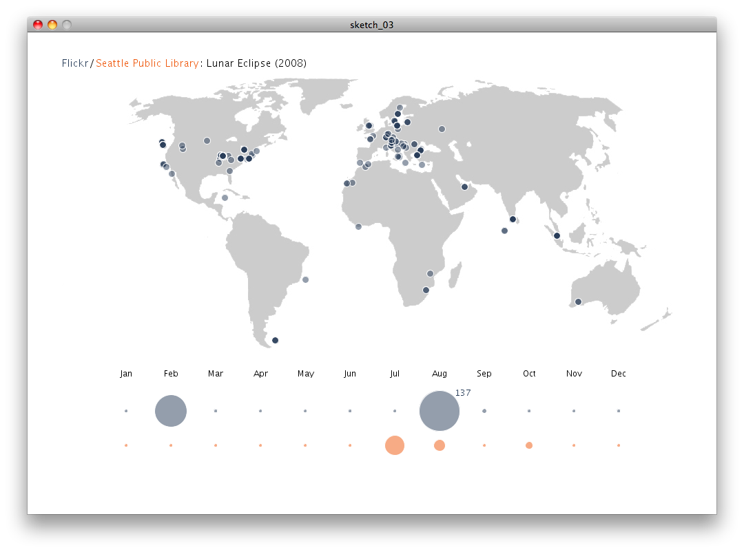 Rollover (circles on world map) reveals date and time taken of the image (YYYY-MM-SS HH:MM:SS) and rollovers on chart reveals number of images taken / number of items checked out in a given month.