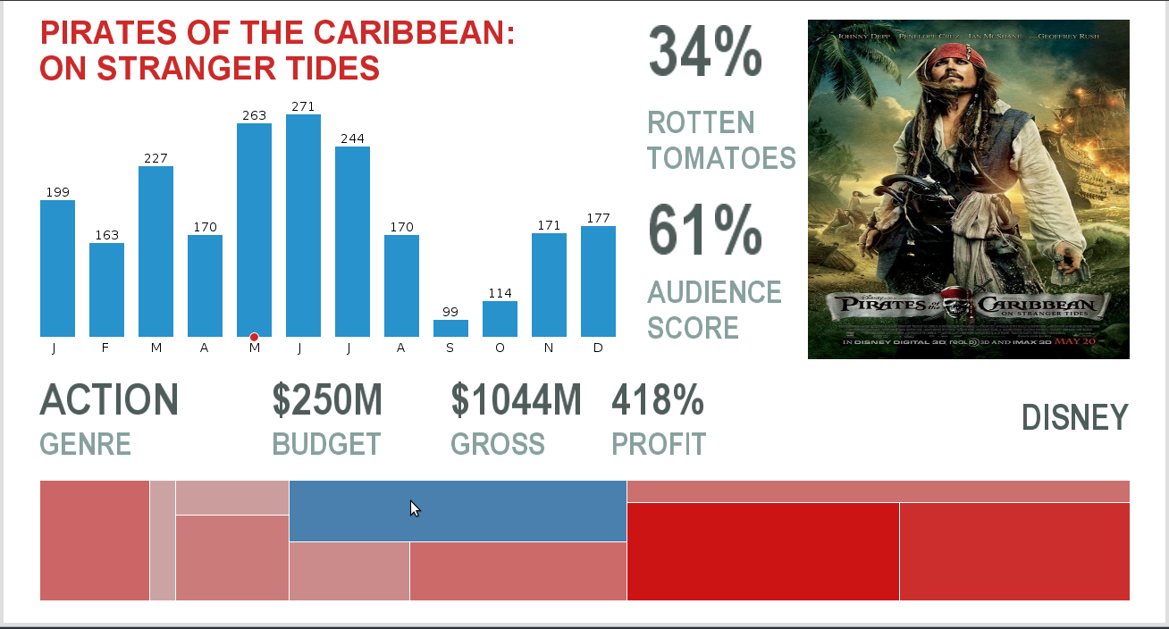 In the visualization, I used a Treemap to represent top 10 grossing movies of 2011 and a traditional bar graph to represent the checkouts of those movie series in SPL for the year 2011.