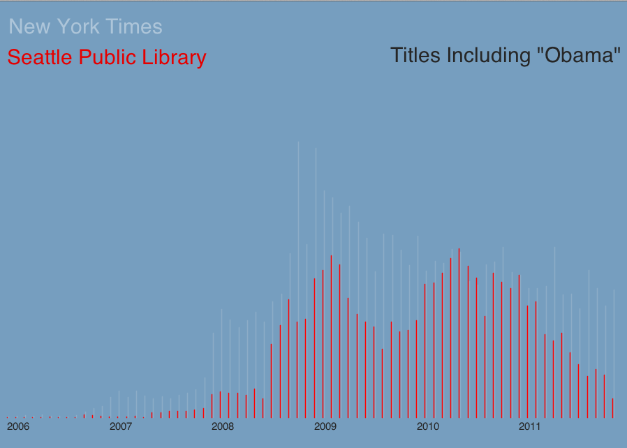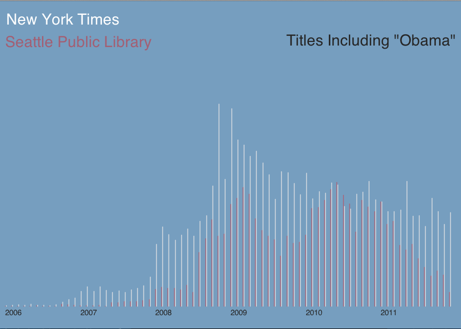 Here is my Correlation Project relating the subject matter of Obama between the SPL and NY Times API database. I found a strong correlation between the 2 sets of data and find it very interesting since the data is from the NW corner of the United States (Seattle) and the NE corner (New York).