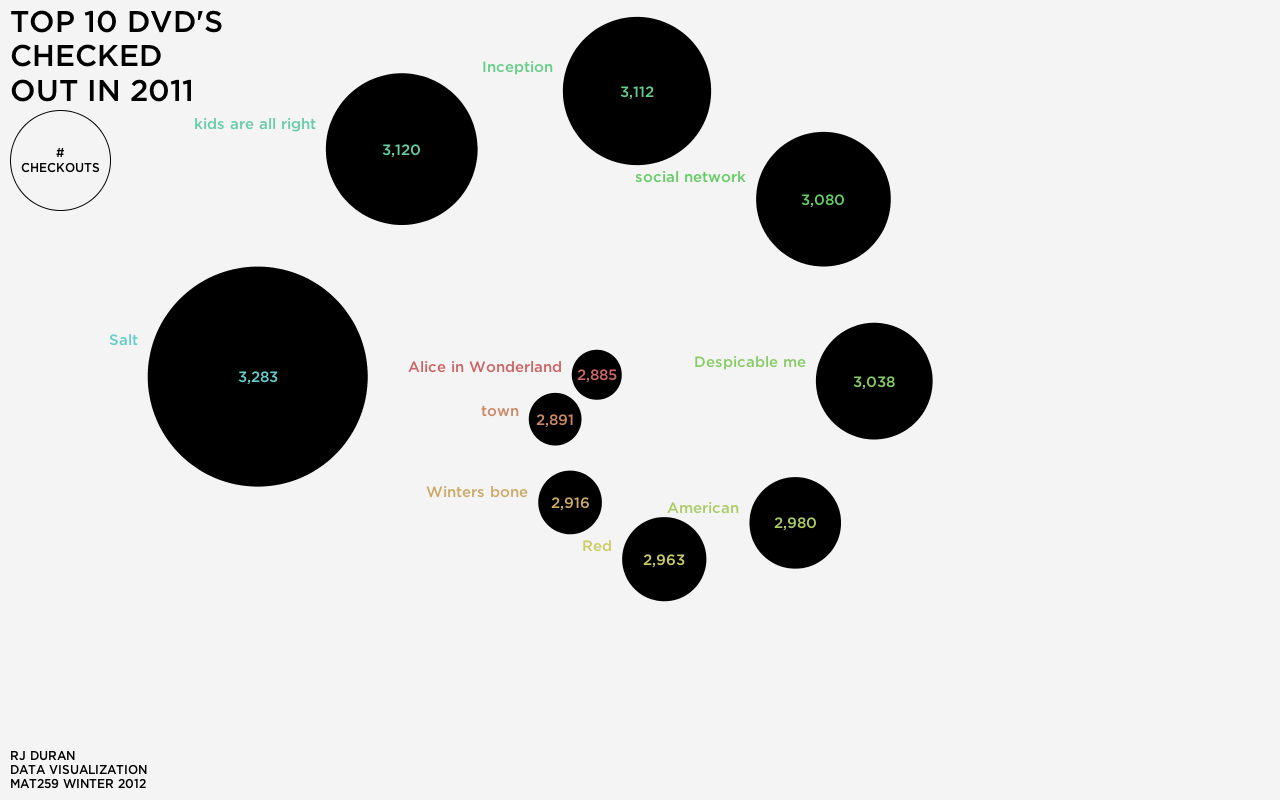 The goal of this project was to become familiar with writing an interesting query to determine the top 10 checked out DVD's of 2011. My idea as you can see from the sketches started out as an interactive timeline that allows the user to explore the top items of a specific itemtype over a time period. I ultimately simplified the project to show 10 items for 2011 to practice combining aesthetic elements with the data set.