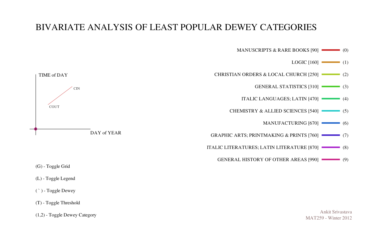 There is a simple amount of interaction to allow the user to navigate through the data for each month within 2011 shown in the bottom left. The mouse was used to provide basic hover functionality showing the total checkouts per day for a given hour. A secondary color palette was also implemented to show dark and light palettes. I used a simple grid to do the layout of elements. The code itself is a little crude since we had somewhat of a short time frame to implement a design but I tried to keep things organized.