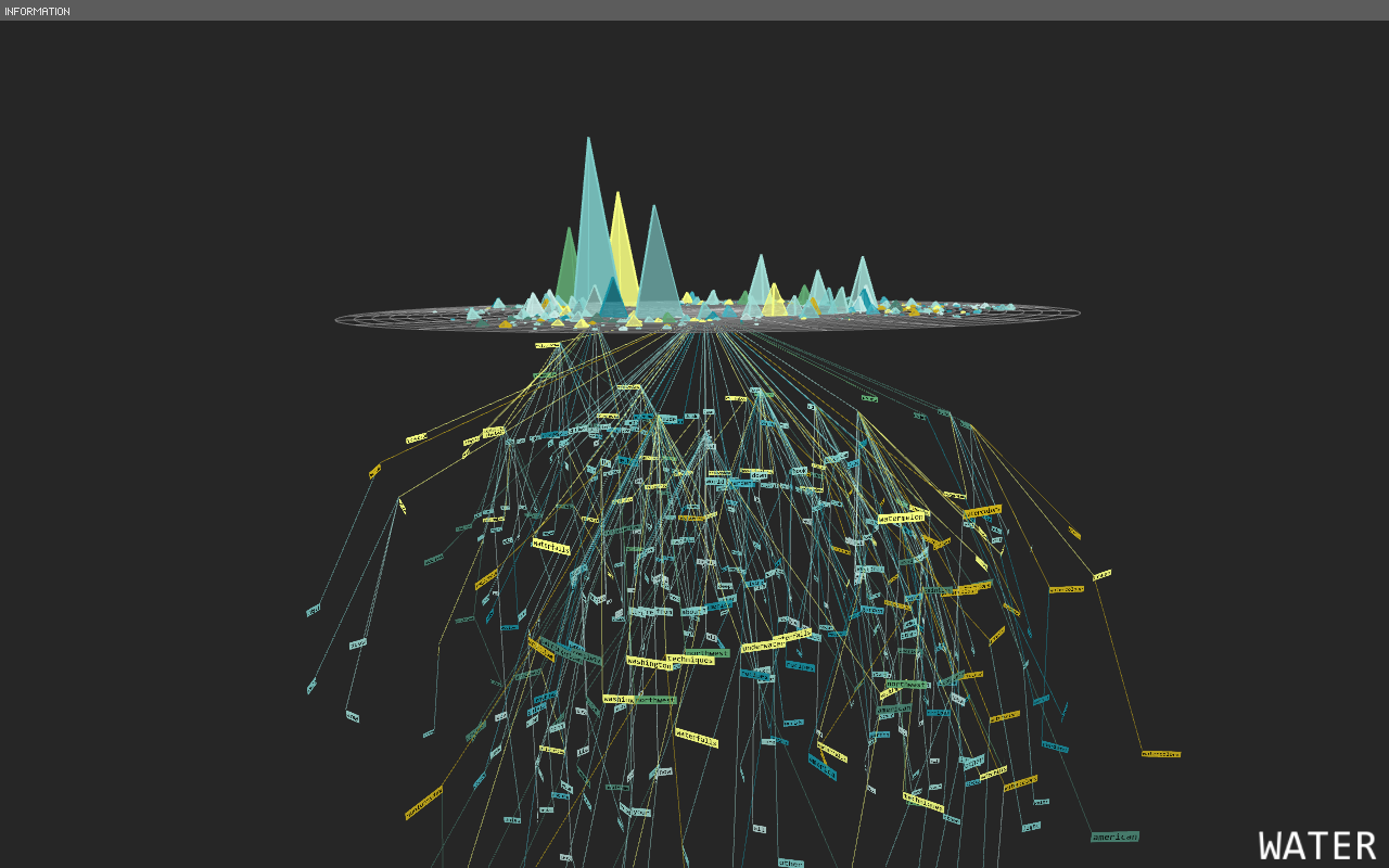 The goal of this project is to visually explore and navigate the connections between words associated with the word “WATER” in book titles from the Seattle Public Library database from 2006 to 2011. By utilizing a partial FP-Tree algorithm to parse incoming book titles I am able to represent visual patterns in associated words. The data is represented as tree structures and volumetric pyramids in a polar plane within a navigable 3D space.