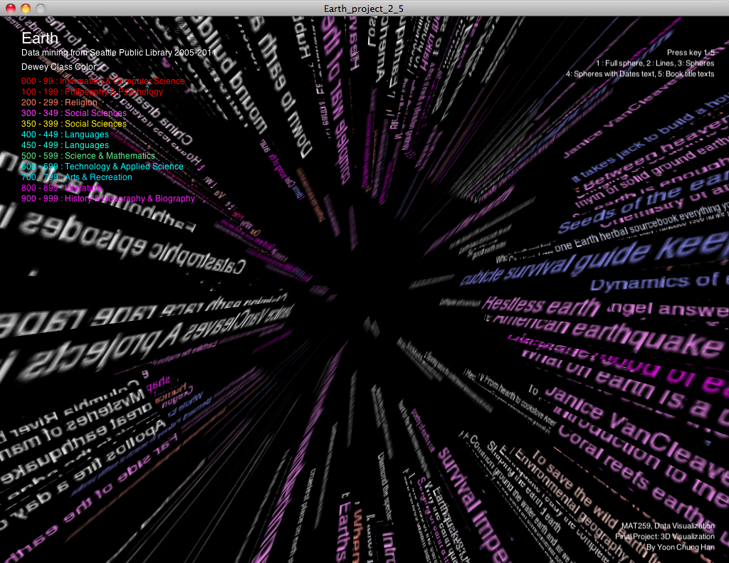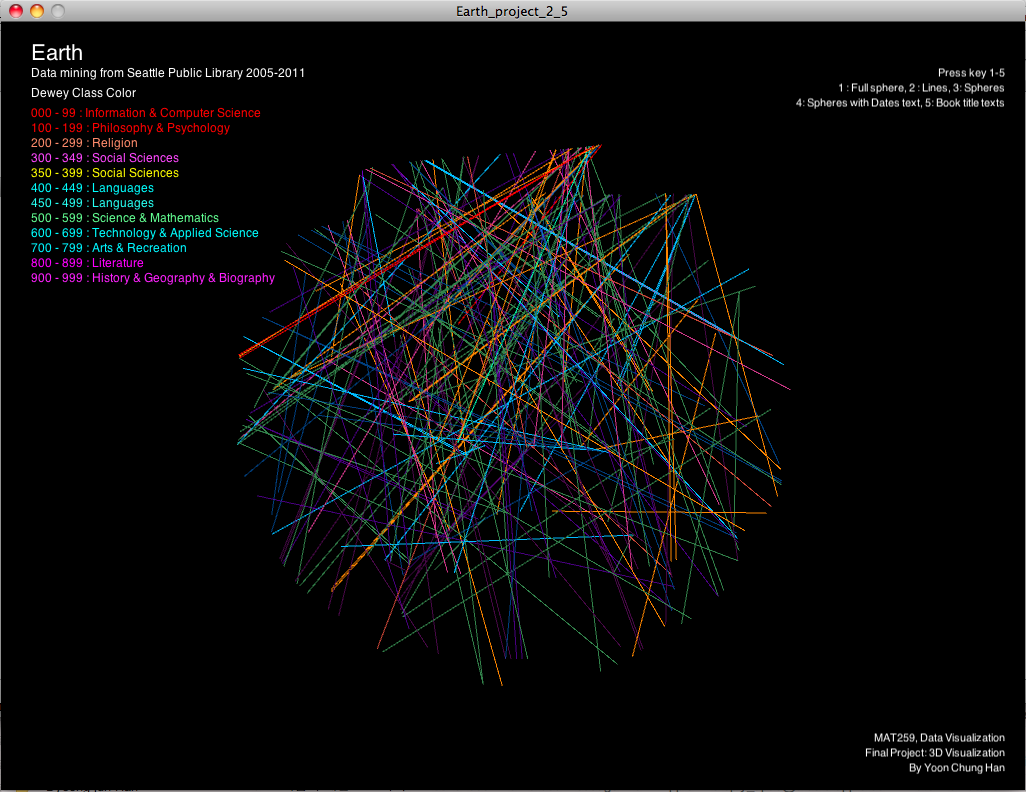 The overall visuals looked like a 3D sphere or Earth. Each different colors represented different Dewey classes. There are two parts of designs: first one is based on 3D sphere structure. Second one is a text sphere. Based on timely spiral shape, small spheres were situated from top to bottom, and the radii of spheres represented the duration of transactions. And the lines across the spheres connected each checked out and in items with the same dewey colors. You can see only spheres, or lines by pressing key 1,2,3. Also, each year,month,day date and duration numbers show up next to each spheres when you press key 4. Finally, all the book titles are shown up from the center, and spread toward to outside. (key 5)