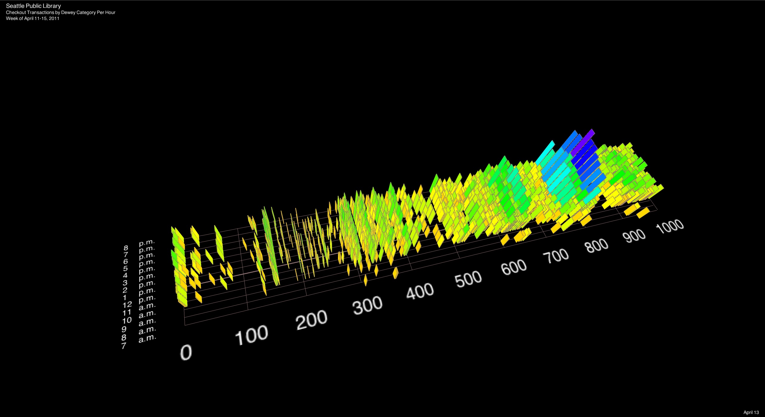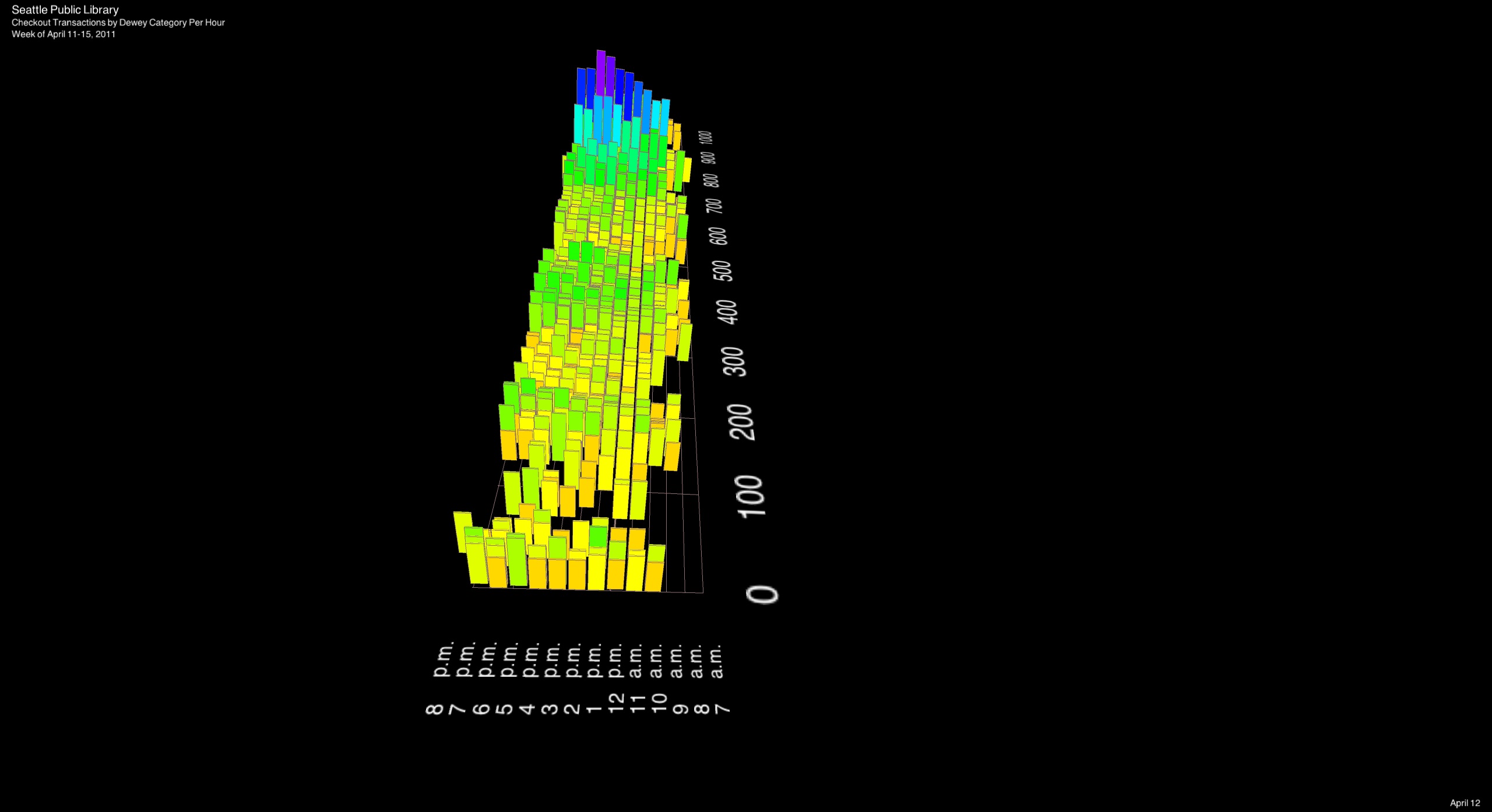 This project is a 3D visualization of all checkout transactions at the Seattle Public Library between April 11-15, 2011. The height and color of the boxes indicates the number of transactions for that hour and Dewey category on a particular day. The user can navigate the 3D space and change the date displayed using the number keys 1-5.