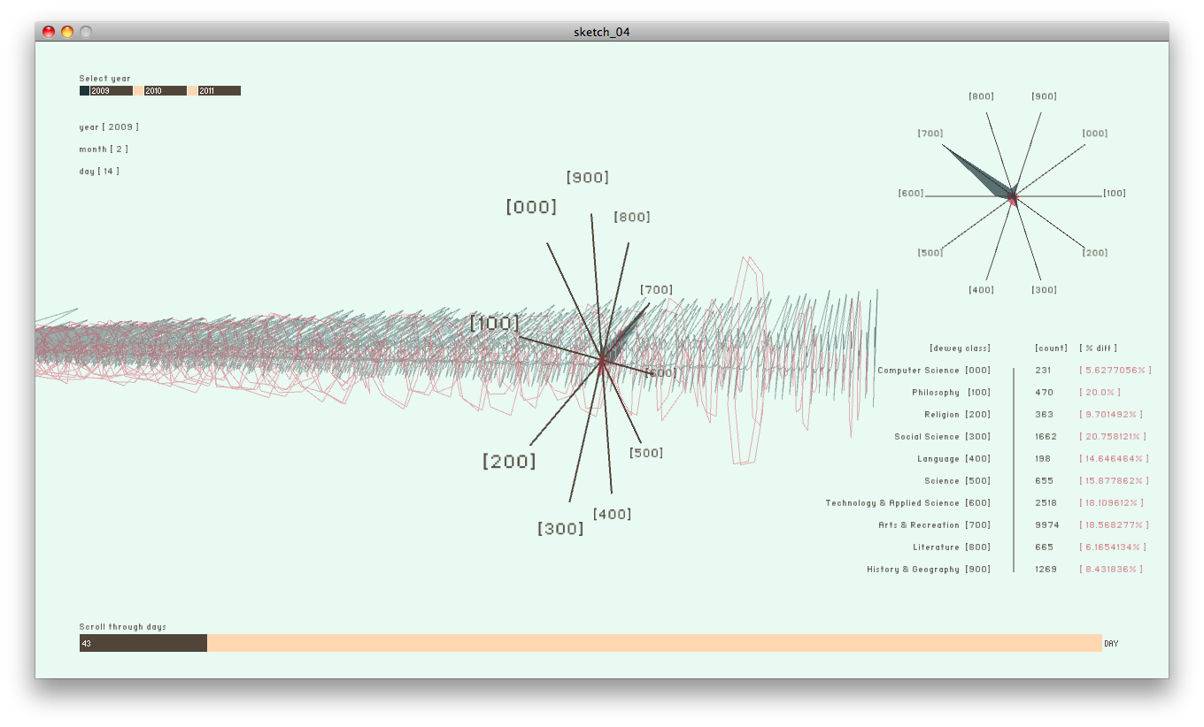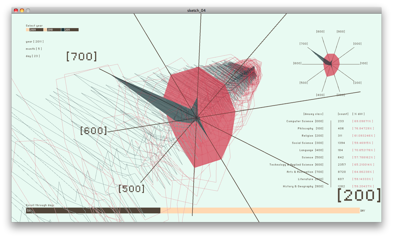 Code: This project displays checkouts in each dewey class category (000 to 900) for the year 2009, 2010 and 2011. Total number of checkouts and absolute difference in percentage is displayed in a radar map, stretched into the z axis with each 'slice' representing one business day. Day, Month and Year selected are displayed on the top left, a 2d radar map along with the actual number of checkouts and difference percentage are displayed on the right hand side of the screen. User navigate through days using a slider located at the bottom of the screen.