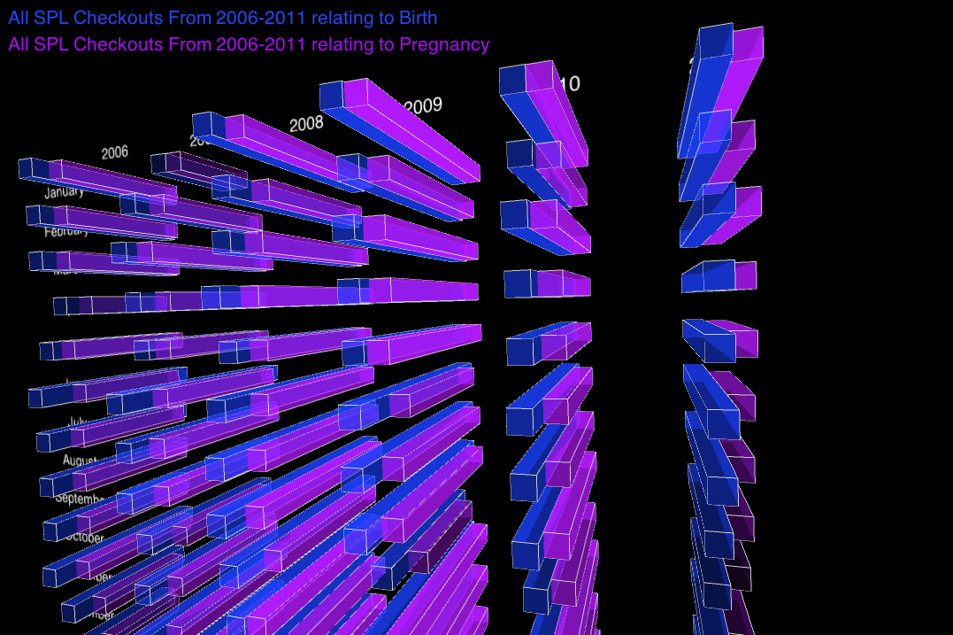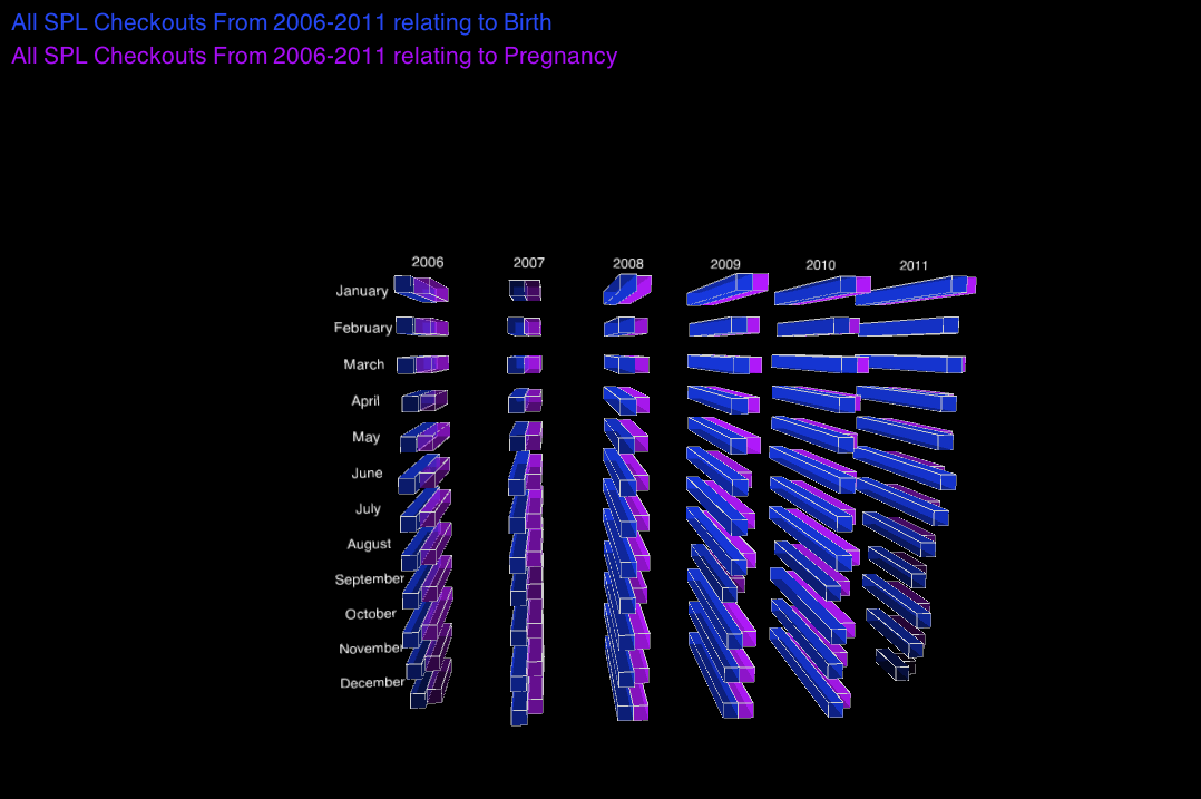 I did in fact find a strong correlation between Birth and Pregnancy over the 6-year span. This was quite evident from the numbers alone but even more clear when expressed in the 3D visualization. It seems that there are more checkouts for these two titles during the first 4 or 5 months of the year, especially during the years 2009-2010. I was trying to propose a hypothesis as to why these two years have the most checkouts but couldn’t find any information to support it.