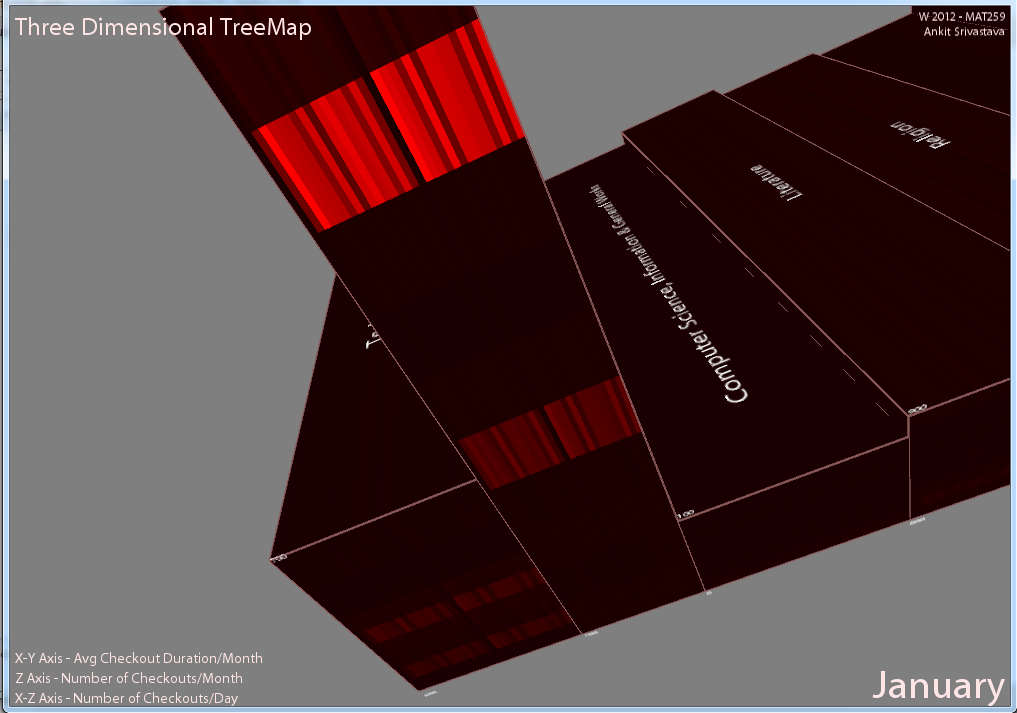 The aim of this project is to extend the capabilities of a 2d treemap visualization and still maintaining hierarchical relationships. In this project, I have represented each tower (cuboid) as a dewey category with the area of the tower representing the average checkout duration for the dewey category in a particular month (You can scroll through the month using keys - 'q' or 'w') and the height representing the total number of checkouts in a month. Each dewey category tower is then subdivided into layers to provide information about each of the sub dewey categories. Each layer represents a sub dewey category and the vertical bars in each layer represent the number of checkouts on each day for the sub-dewey category. Red represents very high activity and black represents zero or very minimal activity.