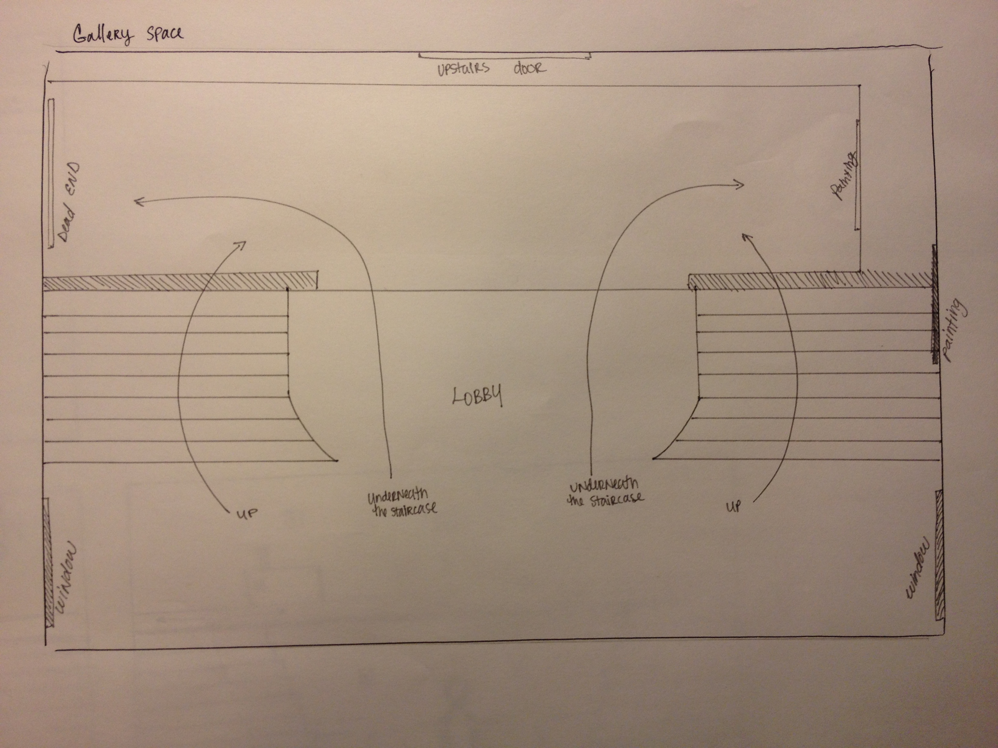 Let’s begin the first scenario. A single member in an audience is chosen and brought into the gallery space. The gallery will be constructed out of boxes that are covered in F-code tabs in such a way that it looks like a double staircase leading to a second floor, underneath the staircase is a hallway that turns left going down to a dead end. A staff member is given the word to let in the user, as the spectator enters the space the iGlasses will show an extravagant chandelier hanging from the ceiling, red carpets that line the staircase going to the second floor, and marble flooring going throughout the room. On the walls hangs pictures of individual persons that are lit by daylight illuminating from windows. Another aspect to the gallery is the overlay of speakers that fill the room to give audio feedback to the actions of the user when interacting with the environment. After the user has a feeling for the gallery space the exploration begins. What helps navigate the user around the space is intentionally placed F-code markers, in comparison to how an audience traditionally walks around a gallery space, these markers are meant to incite intrigue with the user. The eye tracker will measure what points of the mansion seem most appealing, such as a window with a questionable hand print or perhaps a sound that is coming from the hallway. As the user moves around the space observing different objects it is important to realize that he can go over to a vase of flowers and pick it up, the flowers will continuously move in real time and this is achieved because the F-code allows for manipulation of an object to be recognized when the user is in proximity to the object. For this exhibit there will be an intentional path setup as the user navigates after a certain time. First there will be sounds and voices coming from the Hallway under the stairs, the user walks over to investigate. As the user gets closer the eye tracking system picks up the eye focusing on the very edge of the wall as if to expect someone to come around the corner, but no one appears. At the end of the hallway, which is a dead end, is a door and it begins to be thrashed upon from the other side, vibrations from the audio and a shaking door incite emotions within the user to eith investigate or flee. The user takes the latter and decides to flee and instead moves upstairs. The pictures lining the staircase catch the user’s eyes as he ascends. The user has now activated the marker and the pictures begin to animate and follow his presence; The room goes dim and the lights fade. The view through the windows downstairs shows a gloomy sky and lightning strikes. The user approaches a window and a mad faced figure lurks out! While the animation is not real the experience it is giving the user hopefully invites him to more cognitively move around the space and react however one would if moving around an augmented open world.