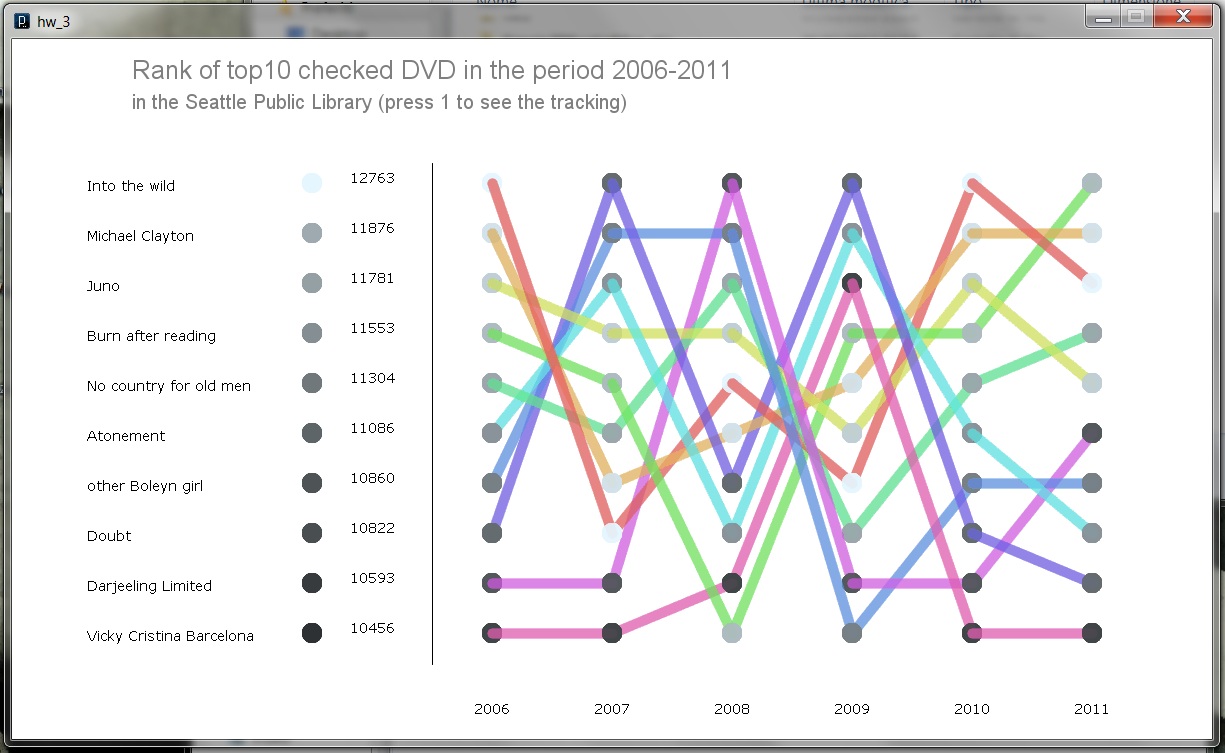 The first step is to decide how your data will map itself within a 2D space. You may have time mapped horizontally (hours of the day) and media type mapped vertically, or the whole Dewey sequence from 0-999. Top layer may be 2010, bottom layer may be 2011. Transparency would allow us to see differences.