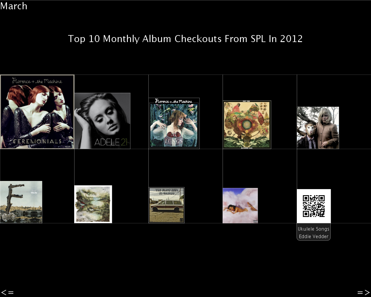 My initial question was "What were the 'Top N' album checkouts per month at the Seattle Public Library over the course of the dataset?" It eventually became "What were the top 10 album per checkouts for each month in 2012?" The results are displayed as proportionally sized album art for each month that reveals album info when clicked (as in the Project 4 image). The latter portion was enabled by correlating with Amazon.com's product listings. The initial plan to correlate against another monthly rating (as in the Project 3 image) have been postponed, but the visual concept can be seen by pressing the 'b' button.