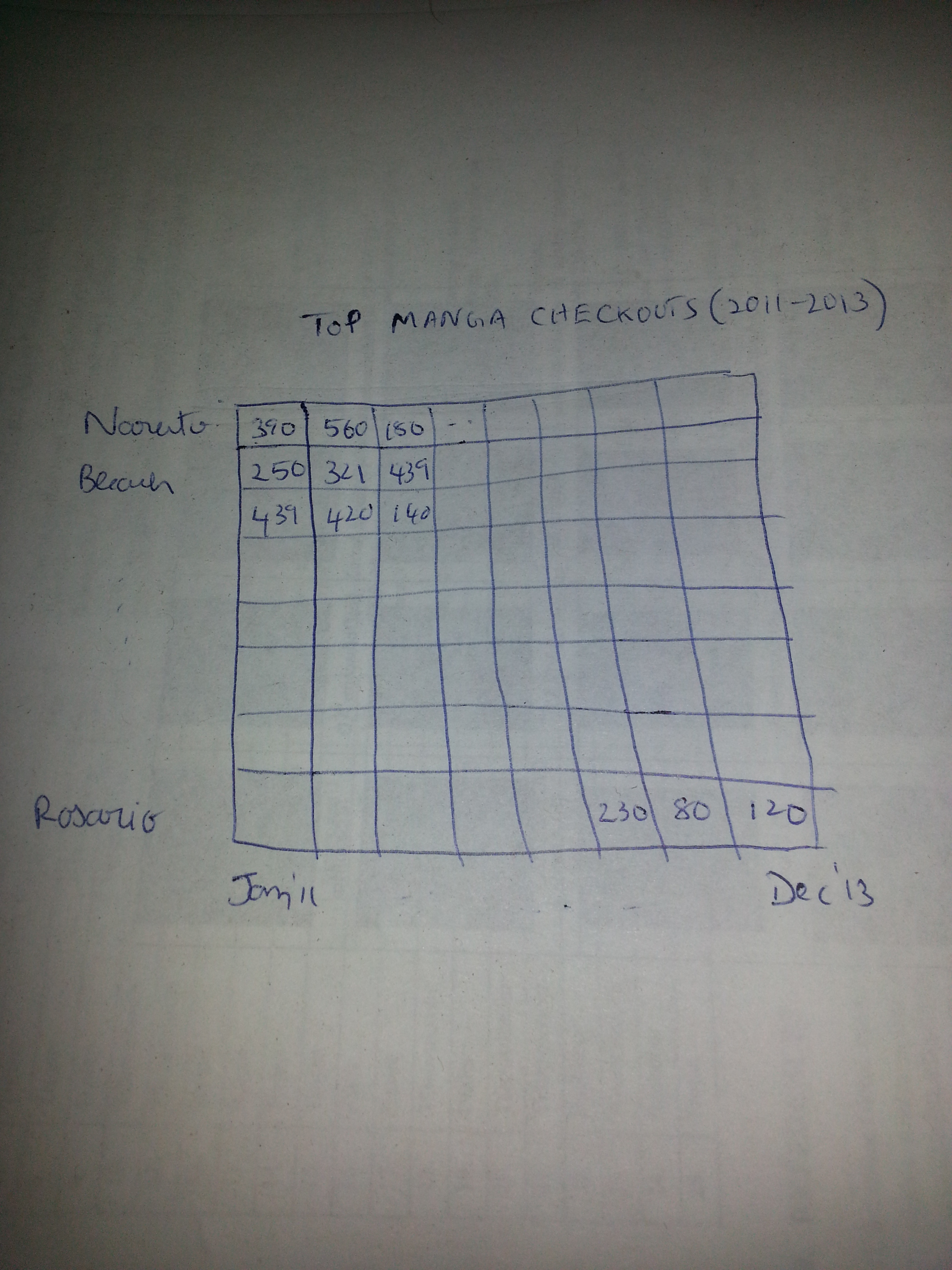 From my first assignment, I observed the variation in the number of Naruto manga/anime checked out every year. In this assignment, I plan to analyze the checkouts for some of the top 10 manga and visualize them in a 2D spatial map. Specifically, I'm interested in observing the trend for every month from 2011-2013 (3 years, 12 months). For every manga, I would end up with a 1-D array of length 36 (12 times 3) and for 10 manga, a 2-D array of width 36 and height 10 (10x36).