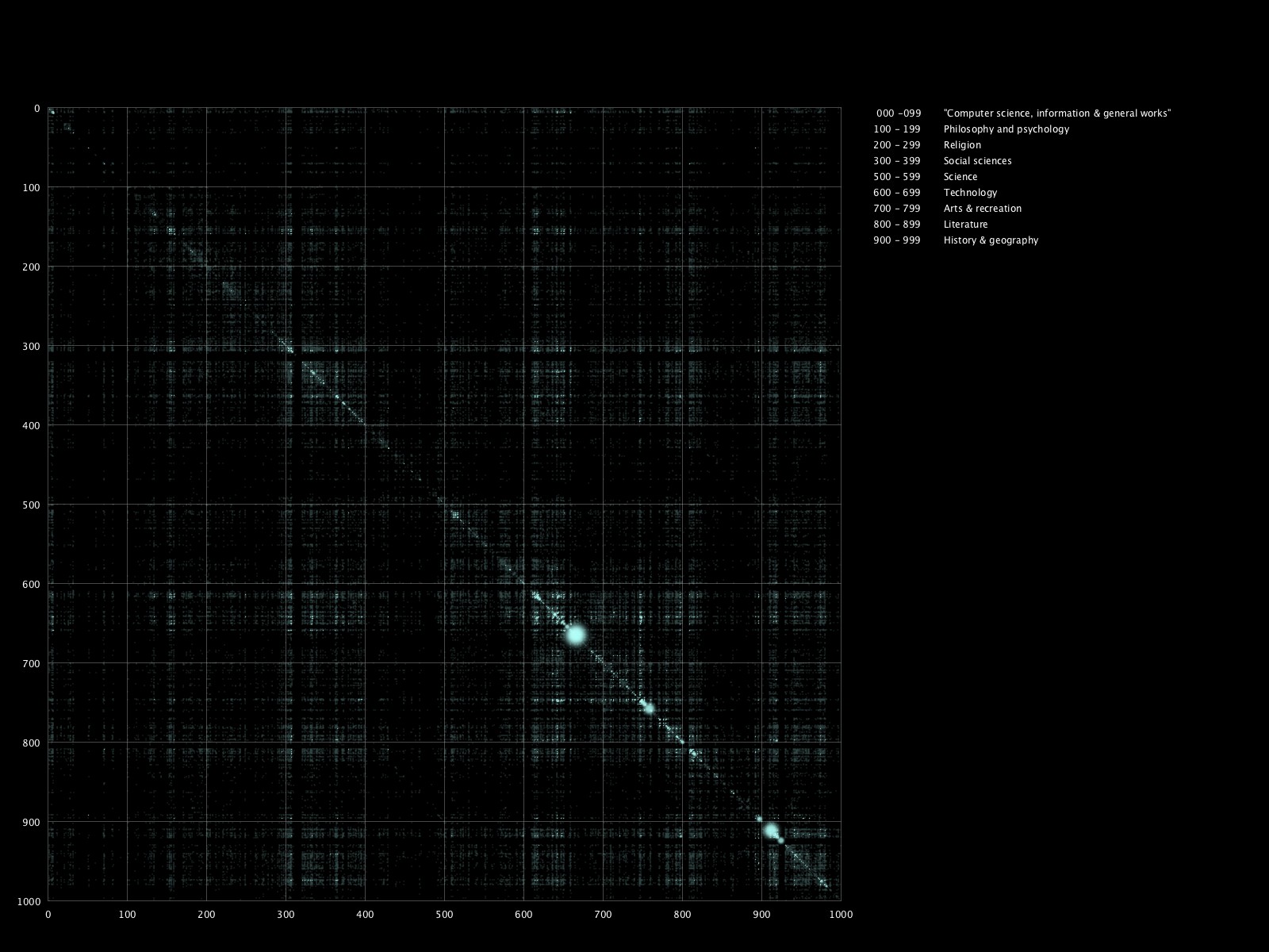 Attached a simple co-occurance matrix with pixel coordinates corresponding to dewey classes. For example, (100,200) shows that items from these categories were checked out together. This is based on data going back to 2010 (1million lines). I excluded comic books from this one.