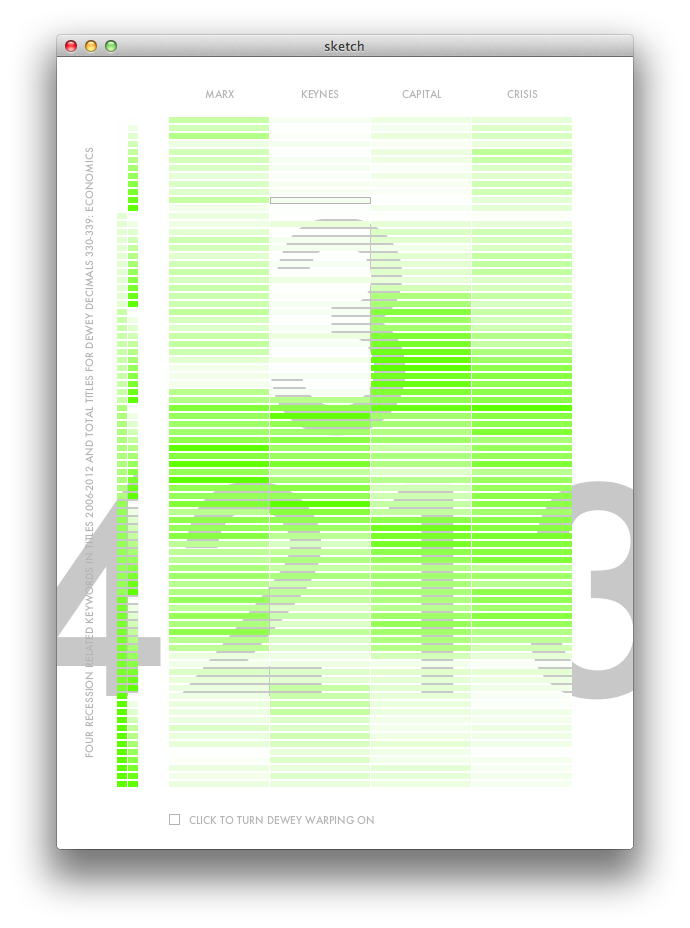 The visualization shows the average lending time for each Dewey class and each year from 2006 to 2013, using a heatmap metaphor. The color scales are designed using HCL Picker (http://tristen.ca/hcl-picker/), which provides a perceptually linear color scale (one exception: the blueish color scale comes from Mathematica). See http://vis4.net/blog/posts/avoid-equidi ... sv-colors/ for the reason why linear RGB/HSV is not ideal for data visualization. Each row of the matrix represents a year, each column is a Dewey category (100 sub-categories). The color of each cell represents the average lending time for the corresponding year and category. There’s a legend showing the color scale at the bottom right.