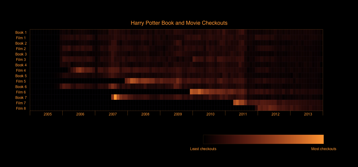 The visualization shows the average lending time for each Dewey class and each year from 2006 to 2013, using a heatmap metaphor. The color scales are designed using HCL Picker (http://tristen.ca/hcl-picker/), which provides a perceptually linear color scale (one exception: the blueish color scale comes from Mathematica). See http://vis4.net/blog/posts/avoid-equidi ... sv-colors/ for the reason why linear RGB/HSV is not ideal for data visualization. Each row of the matrix represents a year, each column is a Dewey category (100 sub-categories). The color of each cell represents the average lending time for the corresponding year and category. There’s a legend showing the color scale at the bottom right.